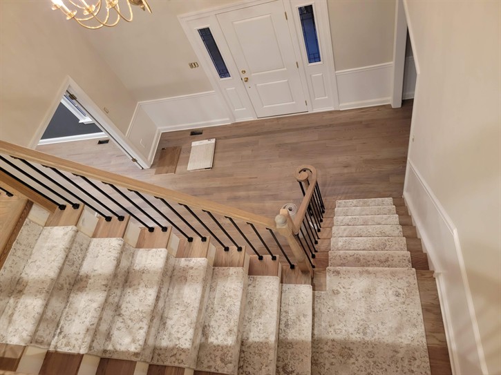 Refinished Staircase and bannister with new designer carpet runner installed.